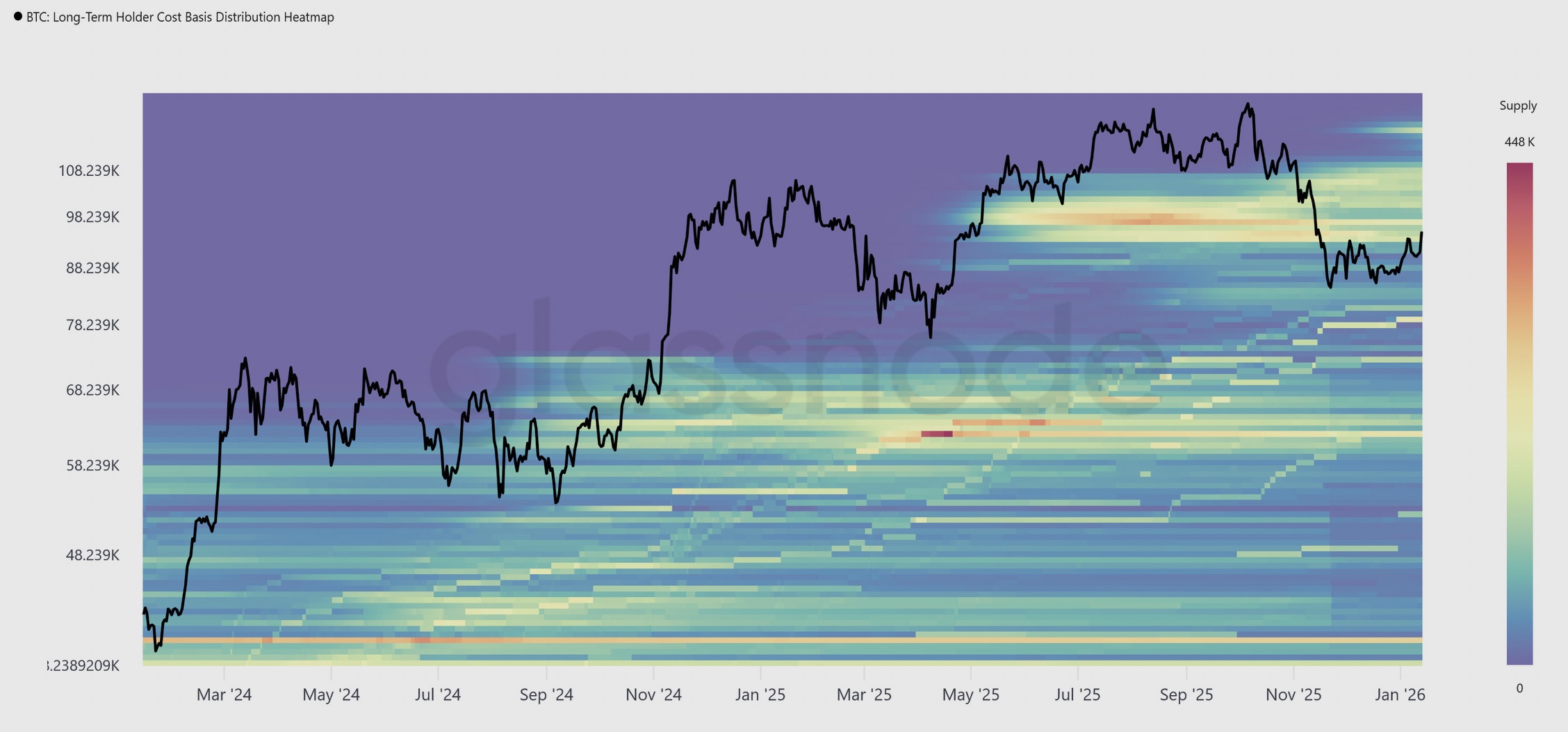 Bitcoin LTH cost basis distribution heatmap. Source: Glassnode